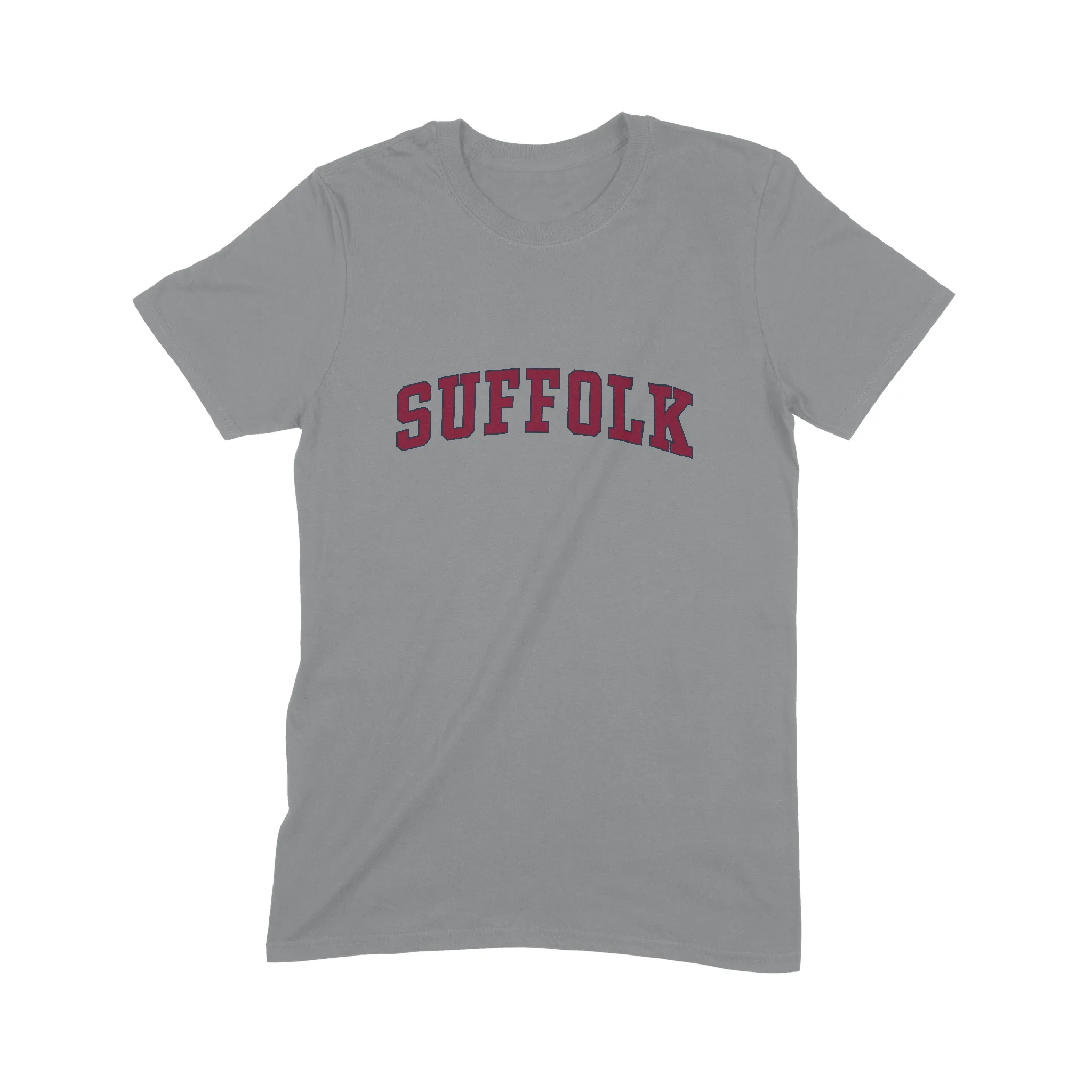 - Vintage Aesthetic: Arched Suffolk text design for the college tee look.