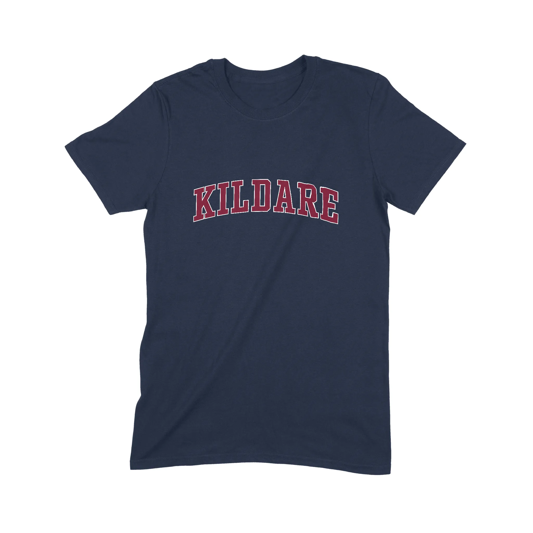 - Vintage Aesthetic: Arched Kildare text design for the college tee look.