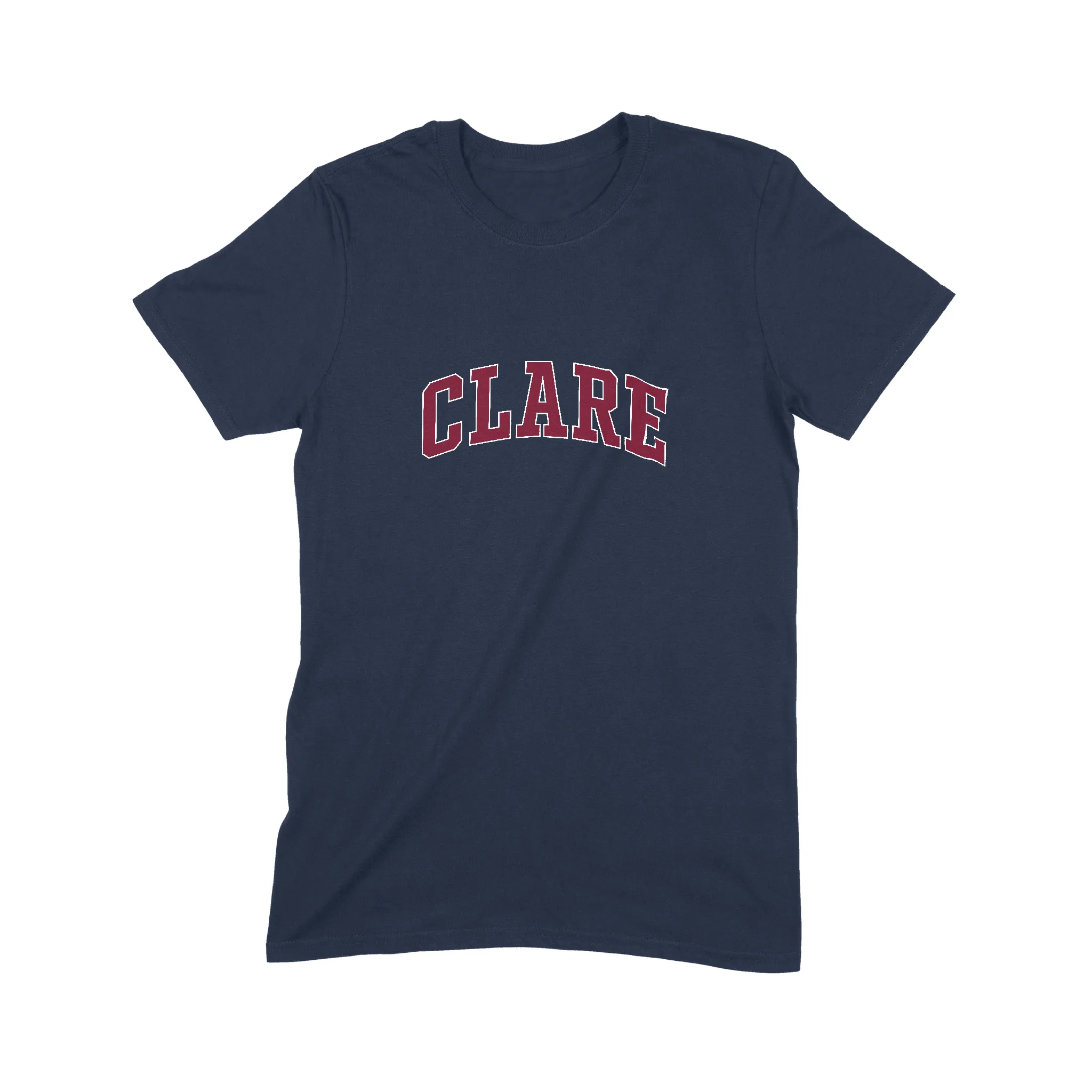 - Vintage Aesthetic: Arched Clare text design for the college tee look.