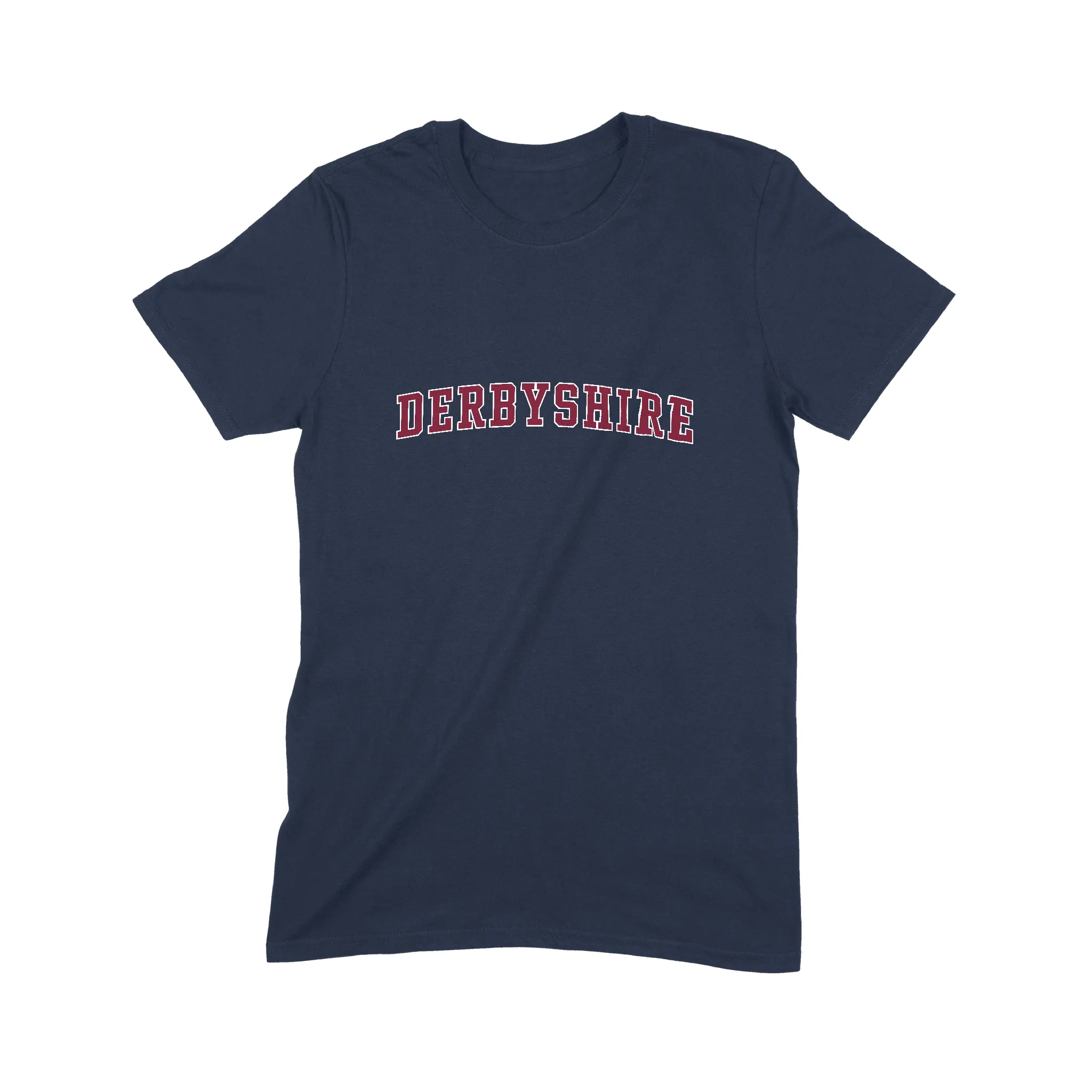 - Vintage Aesthetic: Arched Derbyshire text design for the college tee look.