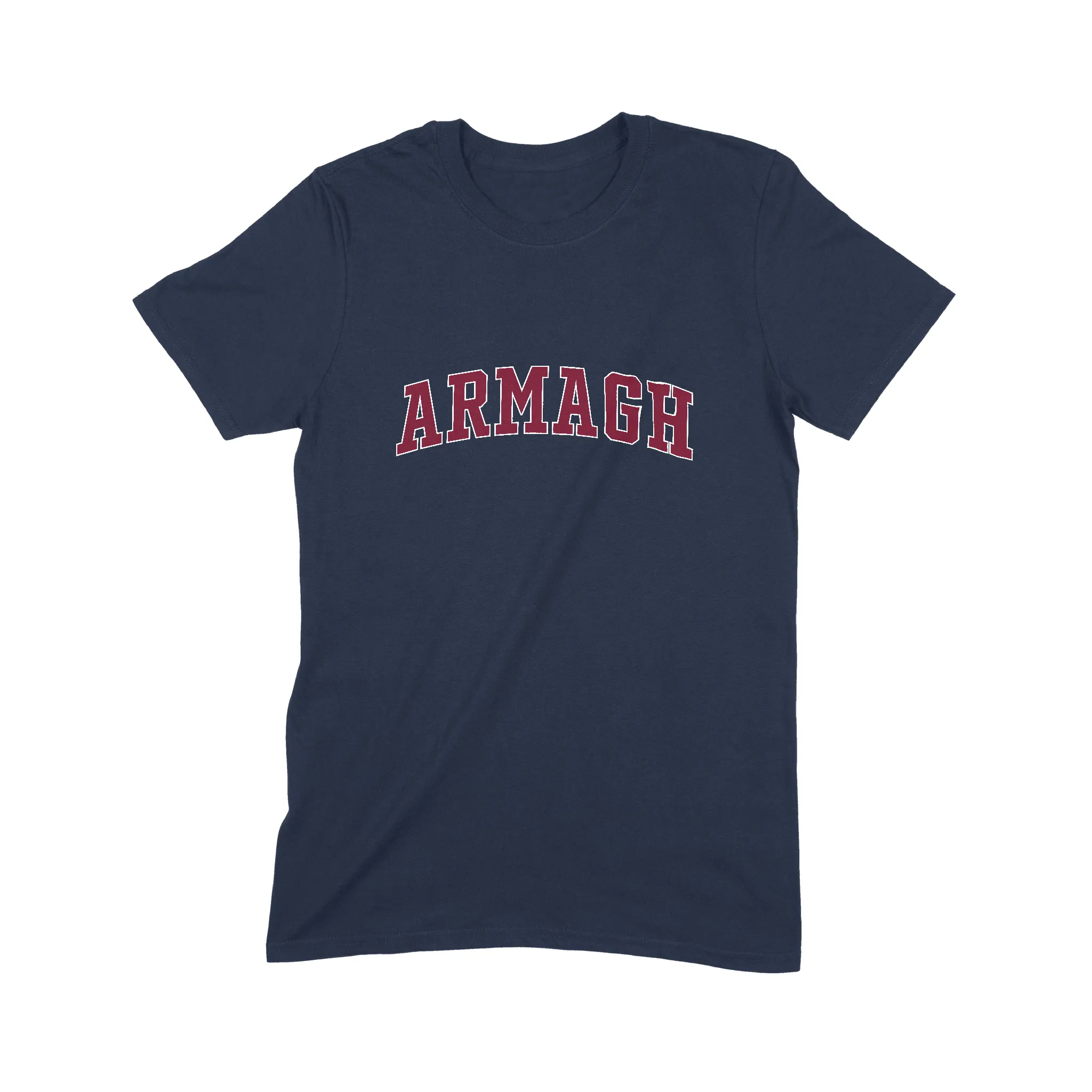 - Vintage Aesthetic: Arched Armagh text design for the college tee look.