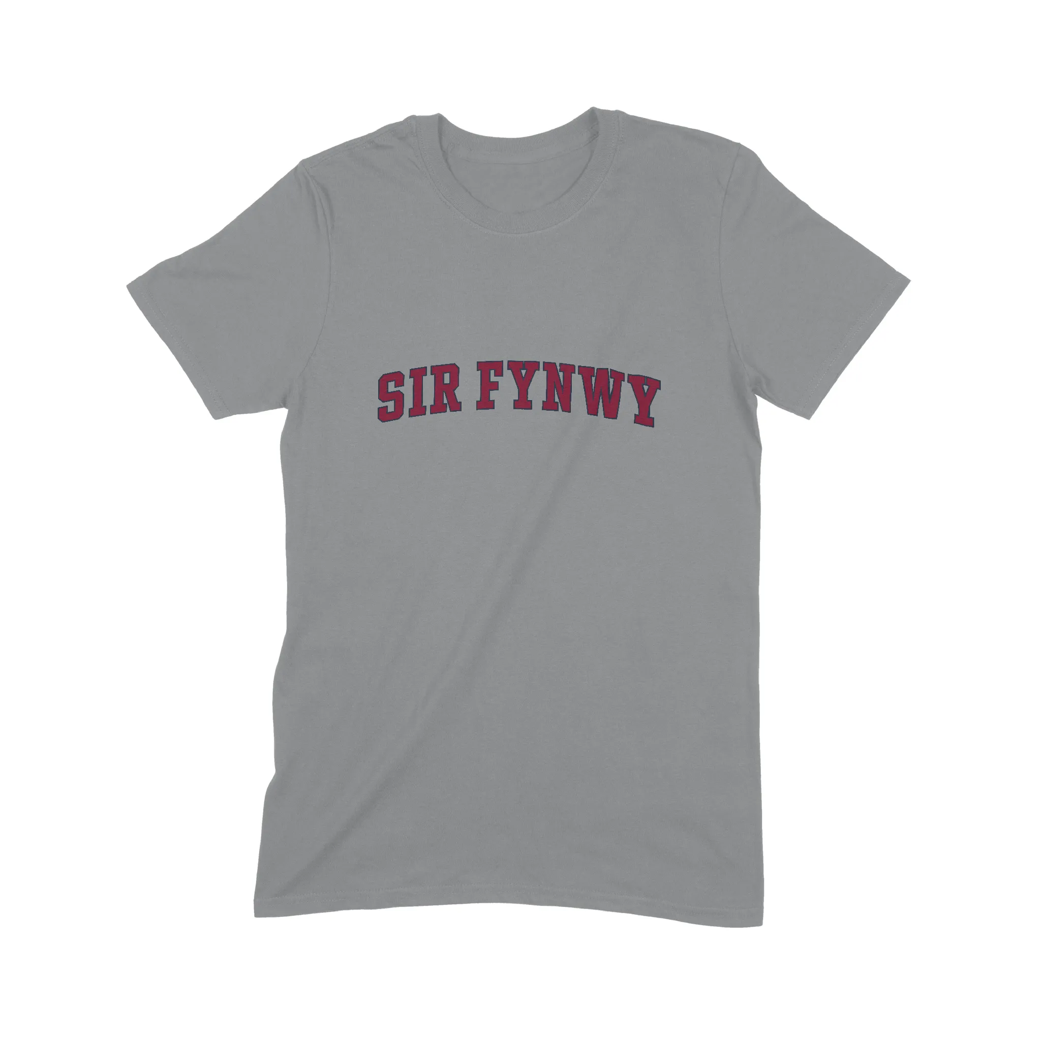 - Vintage Aesthetic: Arched Sir Fynwy text design for the college tee look.