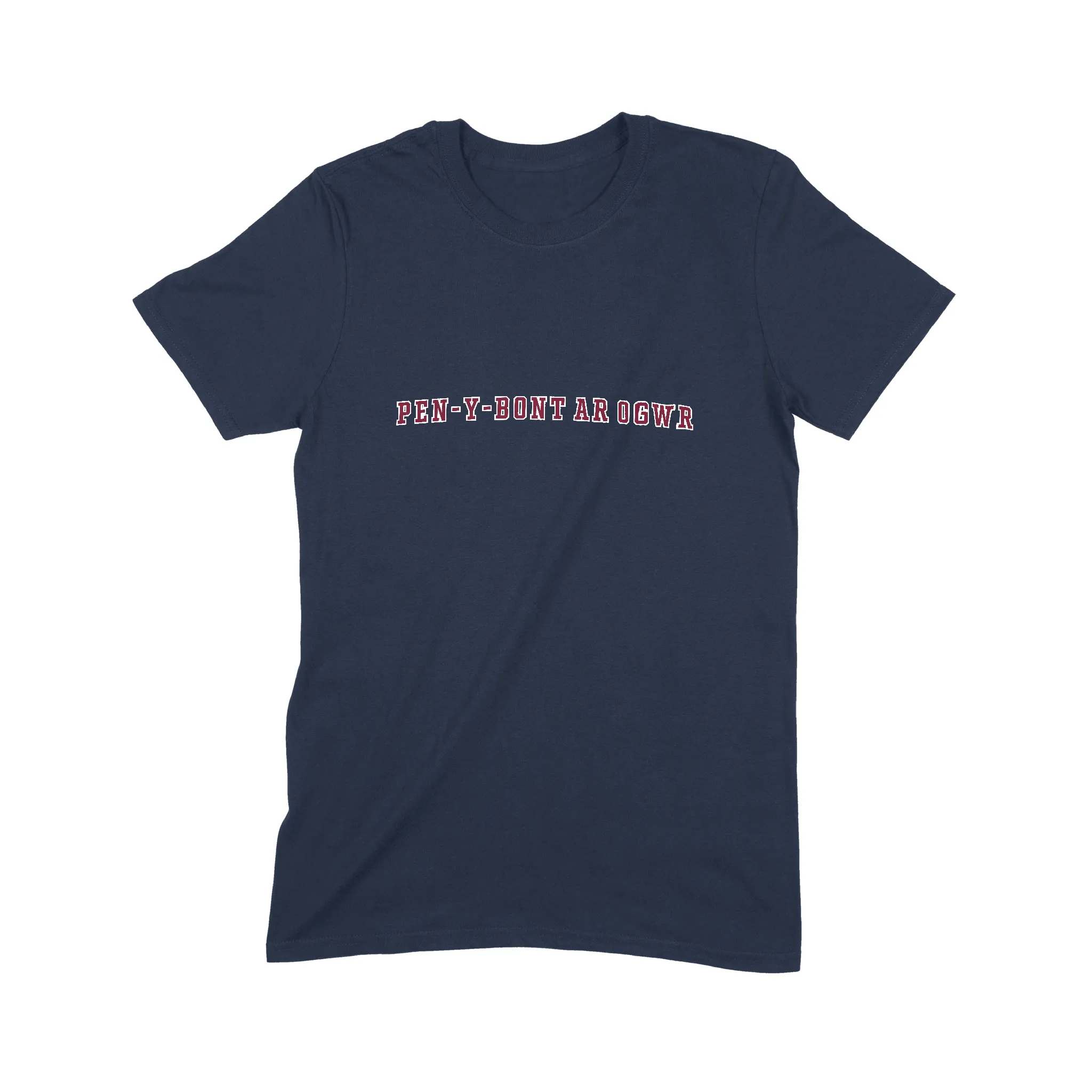 - Vintage Aesthetic: Arched Pen-y-bont ar Ogwr text design for the college tee look.