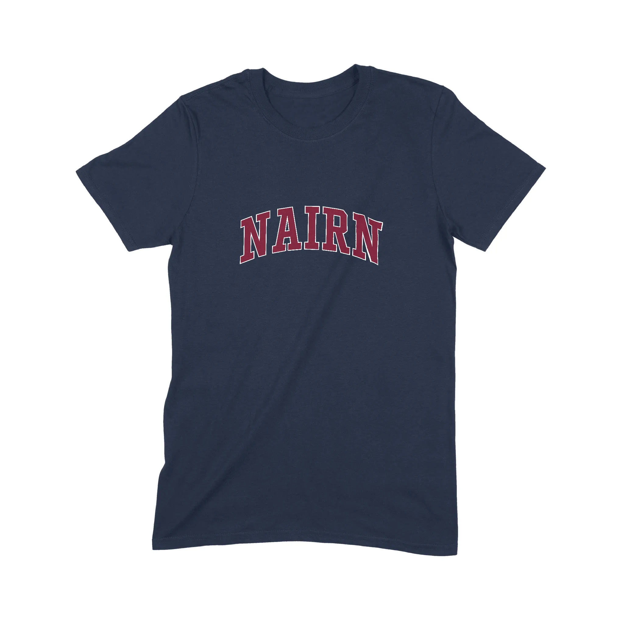 - Vintage Aesthetic: Arched Nairn text design for the college tee look.